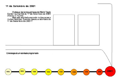 Inicialmente tínhamos a visão objectiva de retratar as torres, pelo que queríamos inserir a sua imagem na infografia, possivelmente com histórias alusivas a pessoas que estivessem dentro das torres. No entanto, sob orientação do professor Bruno Giesteira, decidimos criar uma linha temporal de década, inicialmente sob a forma de círculos, onde iríamos colocar informação de carácter significante que se tivesse passado nos anos anteriores ao atentado.
